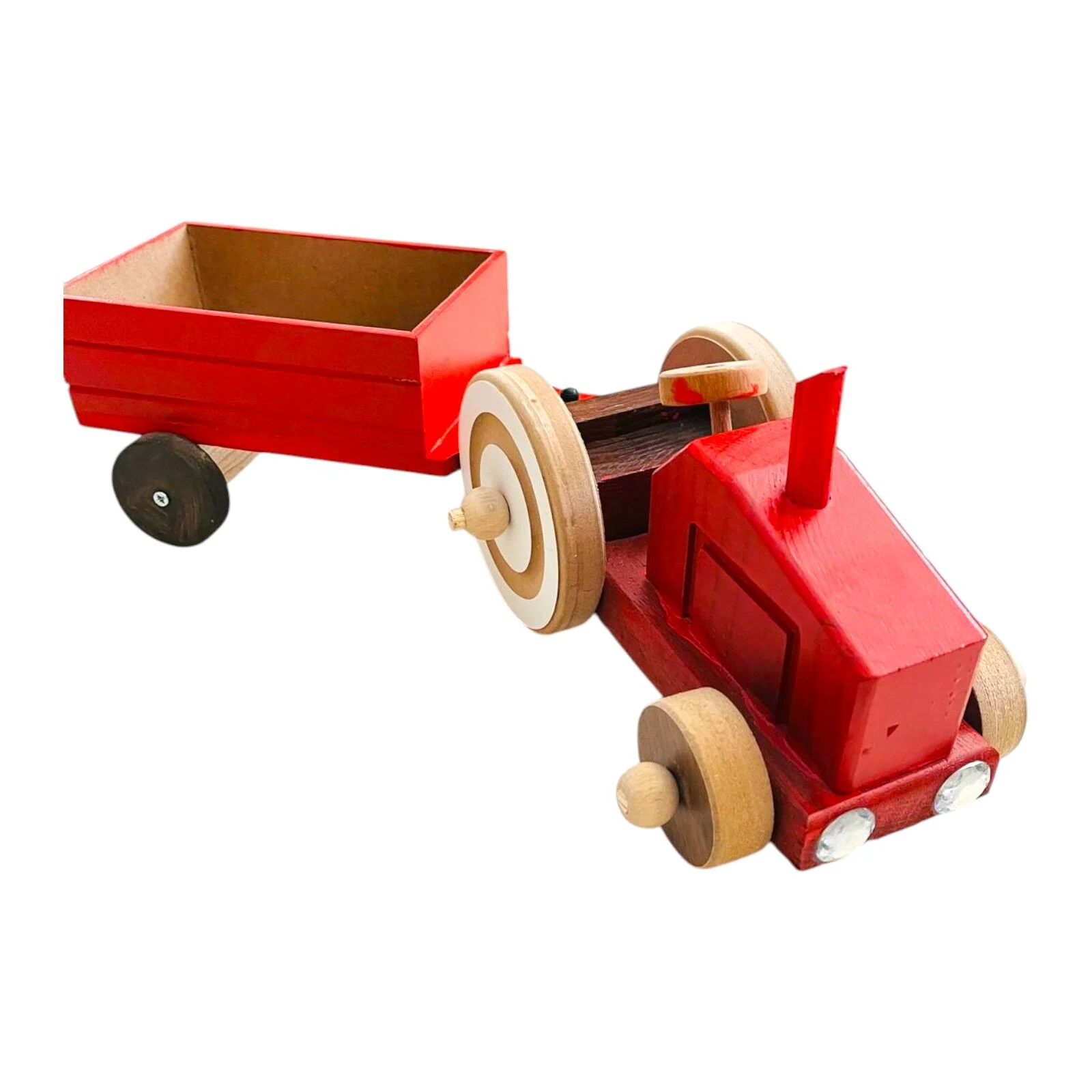Ahşap Römorklu Traktör, okul öncesi çocukların günlük yaşam temalı rol oyunlarını oynayarak öğrenmelerini sağlayan, doğal ahşap malzemeden üretilmiş eğitici bir oyuncaktır.